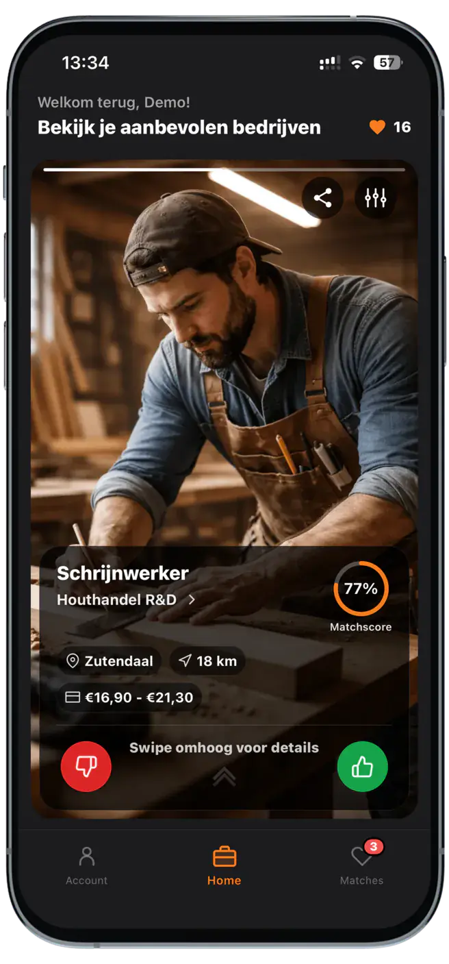 Voor vakmensen in bouw, productie en logistiek. Bekijk bedrijfsvideo’s, zie je loon en reistijd, en swipe. Gematcht? Chat direct. Geen cv’s, geen tussenpersonen.