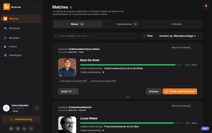 Je betaalt duizenden euro’s per hire. En toch vertrekt 1 op 3 binnen het jaar. Werkvolk is gebouwd voor werkgevers die vakmensen zoeken. We meten je bedrijfscultuur wetenschappelijk en matchen op persoonlijkheid, cultuur en skills. Geen tussenpersoon. Geen cv database. Gewoon de juiste vakmensen, sneller.
